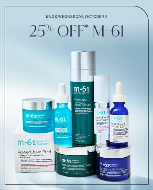 Receive 25% off M-61 purchases between Thursday, October 2, and Wednesday, October 8, 2025. Bundles are excluded. Offer cannot be combined with any other coupons, discounts, promotions, or offers, redeemed for cash, or used for prior purchases. Offer not valid on spa services or product bundles.