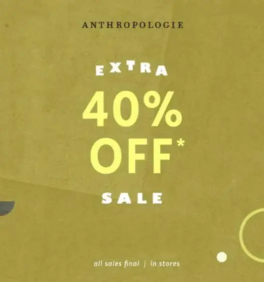 Extra 40% off sale items in US stores for a limited time. Discount taken at register in stores. In-store selection may vary. Not valid in Instagram checkout. Items labeled 'limited time' are priced as marked – no additional discounts apply. All sales are final and cannot be returned or exchanged. Excludes sale furniture, wedding gowns and bridal sets, previous purchases, and/or the purchase of gift cards. Items previously purchased on sale are ineligible for price adjustments. Cannot be combined with other promotions.